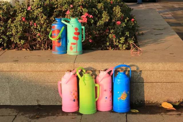 几个开水瓶,五颜六色,感觉就像几对情侣。在享受午后的阳光,让人羡慕